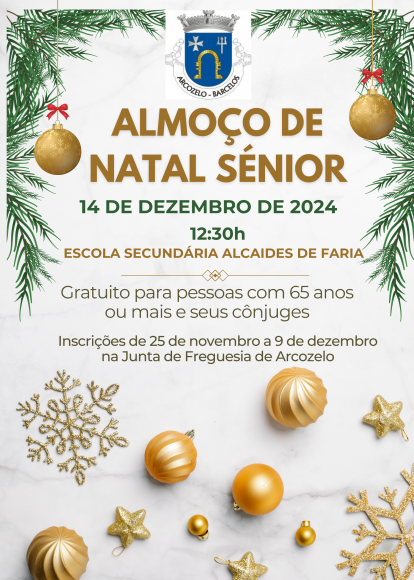 Estão abertas as inscrições para o Almoço de natal Sénior que decorrerá no dia 14 de dezembro, às 12h30, na Escola Secundária Alcaides de Faria.O almoço é gratuito para pessoas com 65 anos ou mais e seus cônjuges independentemente da idade.As inscrições decorrem até dia 6 de dezembro na Junta de Freguesia de Arcozelo.